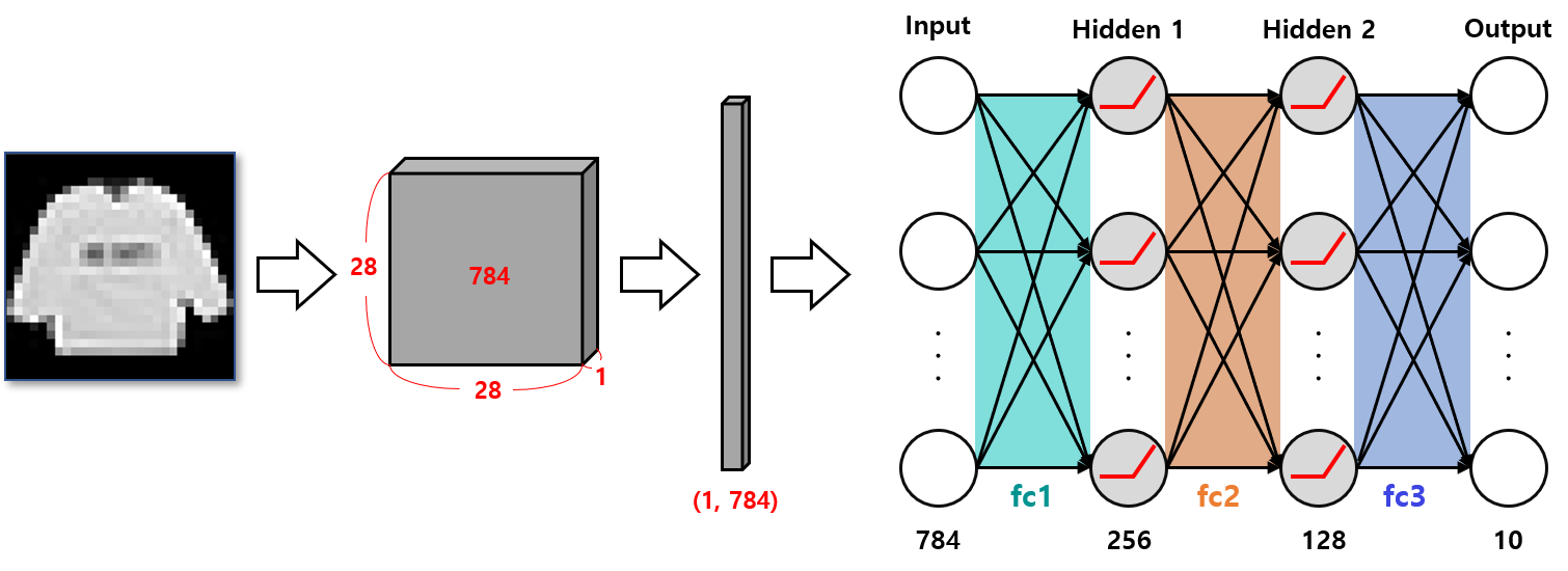 이번 챕터에서는 FashionMNIST를 사용하여, 아래와 같은 DNN 분류 네트워크를 설계하고자 한다.