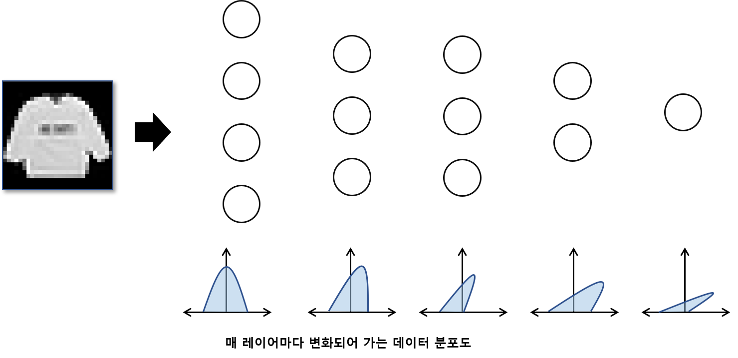 이때 Batch Normalization을 주장했던 논문에서 가장 큰 문제점으로 꼽은 개념은 Internal Covariate Shift라는 개념으로, DNN의 깊이가 깊어짐에 따라 각 layer마다 학습 과정에서 내부 파라미터가 변경되게 되고, 이는 결국 각 레이어마다 학습 데이터의 분포가 초기에 설정한 과정과 점점 다르게 변경될 수 있다는 것을 의미한다. 아래 그림을 참고하면 더 간단하게 이해할 수 있을 것이다.