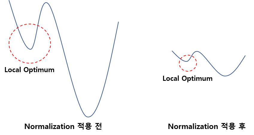 : 간단히 말하자면 activation function의 실제 활성화 값 or 출력값을 정규화(정규분포화) 하는 것을 의미한다. 먼저 정규화의 의미부터 정리하자면, 정규화는 아래 그림처럼 복잡한 네트워크를 완화하여 학습을 더 빨리하거나 local optimum(특정 구간에 빠져버려 더 이상 학습이 진척되지 않는 상태)문제가 덜 발생하기 위함이다.