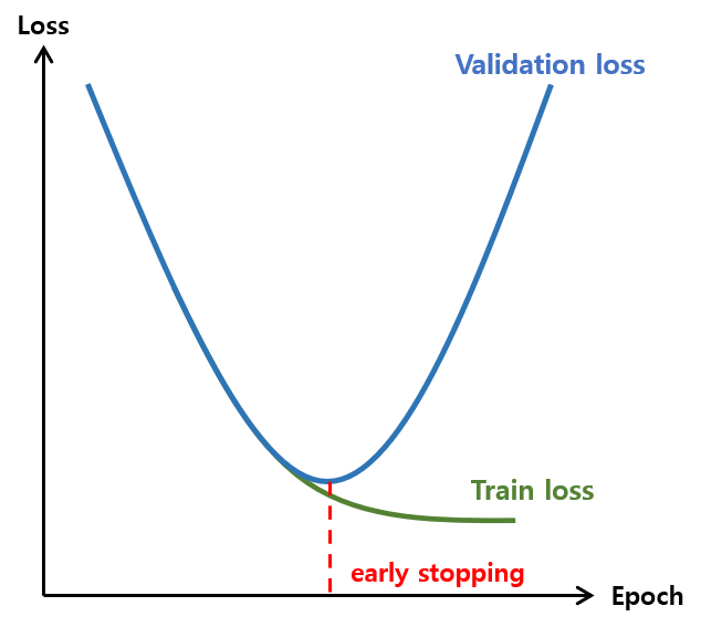 실제 머신러닝에서의 가장 큰 관건은 과적합 방지로, 학습을 무한정 진행하면 결국 validation/test 데이터셋에 대해서는 성능이 떨어지는 것을 확인할 수 있다. 이를 방지하기 위해 매 순간 validation 셋을 사용하여 과적합 여부를 확인하고, validation set에 대해 성능이 나빠지기 직전에 조기 종료(early stopping)하여, 저장하면 해당 모델이 실생활에 가장 적합한 모델이라 할 수 있다.