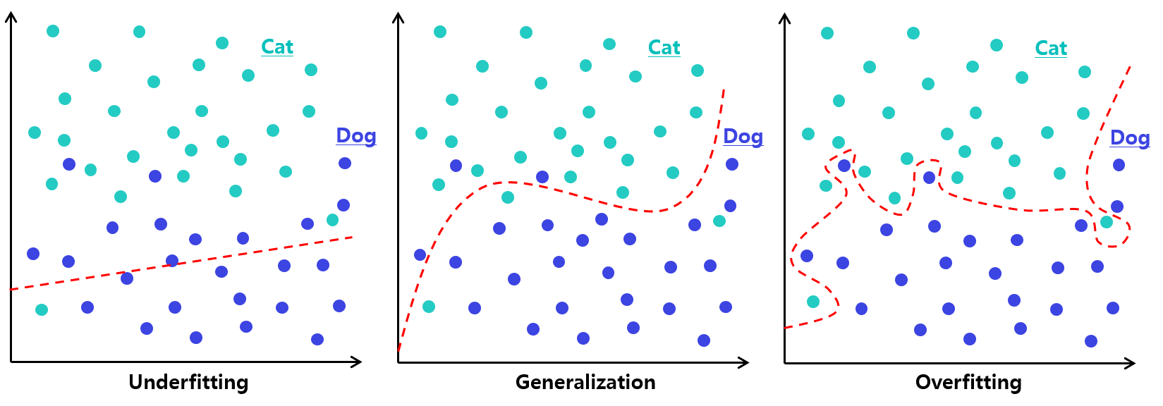 - Underfitting(과소적합) : 학습데이터도 제대로 학습하지 못한 경우