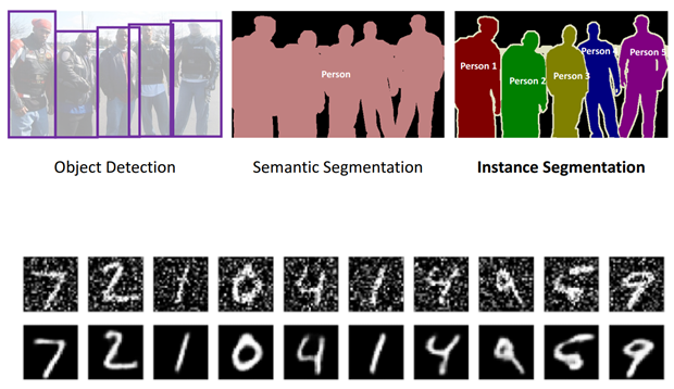 오토 인코더는 주로 복잡한 비선형 데이터의 차원을 줄이는 용도로 쓰이며, 비정상적 거래 검출, 데이터 시각화-복원, 의미 추출, 이미지 검색 등에 사용되기도 한다. 또한, 아래 사진처럼 이미지를 의미있는 부분으로 모든 픽셀에 대하여 예측할 수 있는 Semantic Segmentation 과정이나 이미지의 노이즈를 제거하는 Noise Reduction 과정에도 활용될 수 있다.