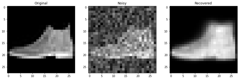 차근히 읽어보면 FashionMNIST의 test셋을 불러온 후, 그 testset중 이미지 한 장을 갖고와 모델의 입력이 될 수 있도록 전처리 하는 단계가 sample_data 정의부이다. 이후, add_noise함수로 동일하게 노이즈를 주고, autoencoder의 입력으로 (noisy_x)를 줬을 때 복원된 값을 recovered_x로 받는다. plt함수로 시각화를 주고, 관찰해보면 아래 이미지처럼 어느 정도 노이즈를 추가한 이미지에 대하여 원본 이미지만큼 복원하는 것을 알 수 있다.