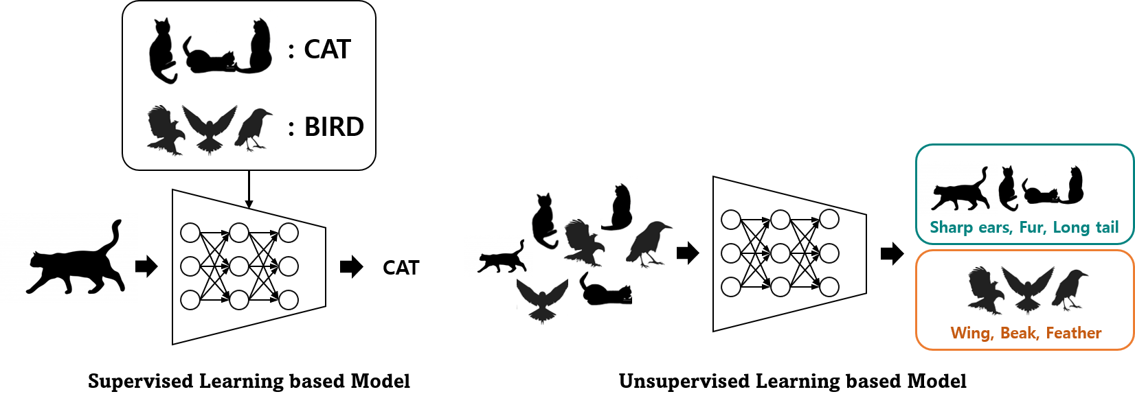 - Unsupervised learning : 데이터-데이터 라벨(입력 - 출력)쌍이 정의되지 않은 데이터로 학습하는 경우