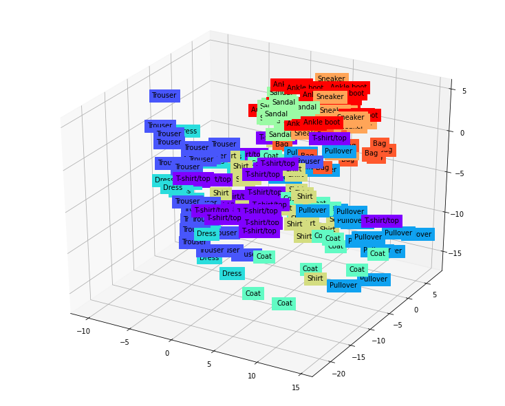 하지만 확실히 흥미로운 점을 몇가지 알아보자면, 비슷한 레이블을 갖는 이미지의 잠재변수는 서로 모여 있다는 것을 알 수 있을 것이다. 각 레이블끼리 비슷한 색상끼리 묶여있음을 알 수 있으며, 여기에 더하여 Ankle boots, Sneakers, Sandal과 같이 신발과 관련된 변수들은 서로 공간적으로 가깝게 자리하고, 반대로 T-shirts/top, coat, dress, trouser와 같은 상의류도 서로 가깝게 겹친다는 것을 알 수 있다.