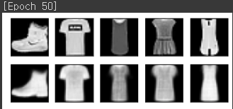 아래 이미지가 실제 학습 과정에서 출력되는 이미지 이며, Epoch 1과 Epoch 50의 차이를 확인해보자.