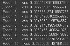 Epoch은 10으로 설정했고, 점점 학습이 진행되면서 오차도 줄어드는 것을 확인할 수 있다.
