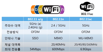 - Unlicensed band(ISM band) : 2.4GHz for 802.11b/g/a, 5GHz for 802.11a/n/ac