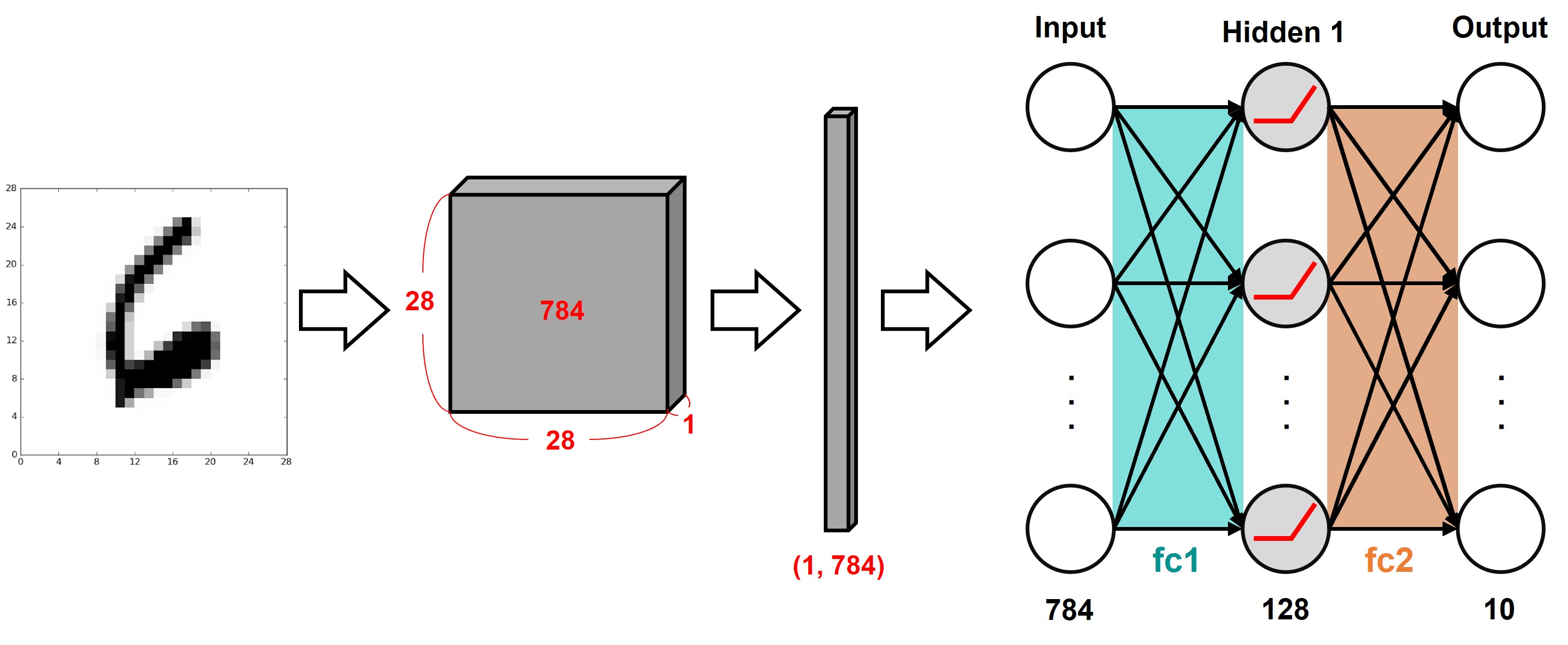 앞에서 필요한 데이터를 다 로딩했다면, 본격적으로 모델을 구성해보자. 여기서는 Fully Connected Layer로 구성된 단순한 모델을 사용한다. 모델을 구성하는 각 레이어를 분석하면 아래 그림과 같다.