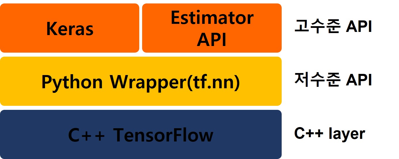 가장 상위 구조로는 Estimator API나 케라스와 같이 고수준 API가 설계되어 있다. Estimator는 머신러닝 모델을 쉽게 구성할 수 있게 해주는 사전 제작된 구성요소를 포함하고 있다.(가장 기초적인 템플릿, 구성 요소라 생각하면 된다.)