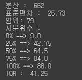 - 사분위수 : 데이터를 4등분한 값. 25%를 1사분위수($Q_{1}$), 50% 값을 2사분위 수($Q_{2}$), 75% 값을 3사분위수($Q_{3}$)