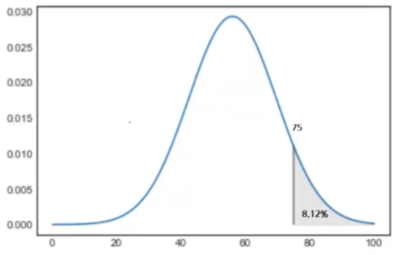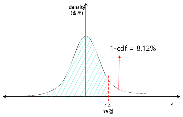 ex) 시험 점수가 정규분포를 따른다고 가정할 경우, 평균 점수가 56점이고, 표준편차가 13.6인 경우 75점 이상을 받은 학생들은 몇%인가