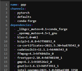 생성된 yaml 파일은 다음과 같이 가상환경 이름과 채널, 필요한 디펜던시(라이브러리) 목록이 나열되어 있다.