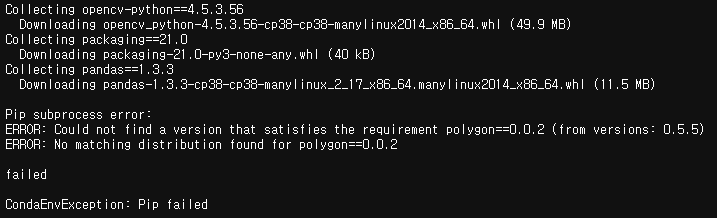 이건 실제로 pip로 라이브러리를 설치하는 과정에서 해당 버전을 찾을 수 없다는 내용으로 yaml파일에서 해당 라인을 삭제하거나 다른 버전으로 교체해주고 가상환경을 재-생성해주면 문제 없이 만들 수 있다.