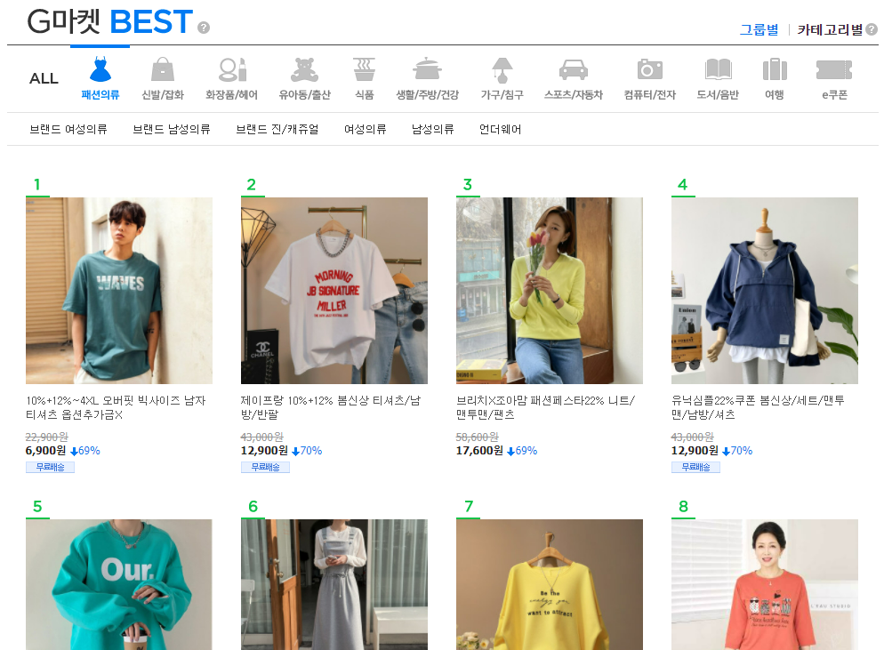 G마켓 best품목 중 각 클래스에 대해서 100개의 상품이 나열되어 있음