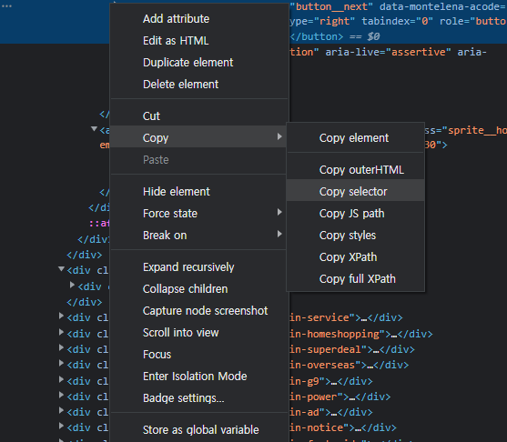 인터넷 창에서 F12눌러서 해당 파트 찾은 후, 우클릭 한다음 copy>copy selector를 통해 복사하면 자동으로 해당 파트를 받아오는 코드가 카피된다.