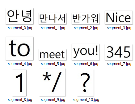 이후, for문으로 잘려나간 컨투어 값들을 확인해보면 다음과 같이 잘린 단어들을 확인할 수 있다.