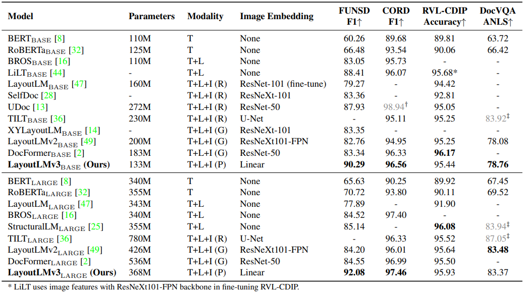 - LayoutLMv3 : first multimodal model that doesn’t rely on a pre-trained CNN or Faster R-CNN backbone → save parameters, eliminate region annotations.