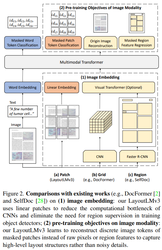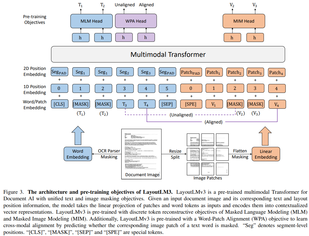 - LayoutLMv3 is pre-trained with a word-patch alignment objective to learn cross-modal alignment by predicting whether the corresponding image patch of a text word is masked.