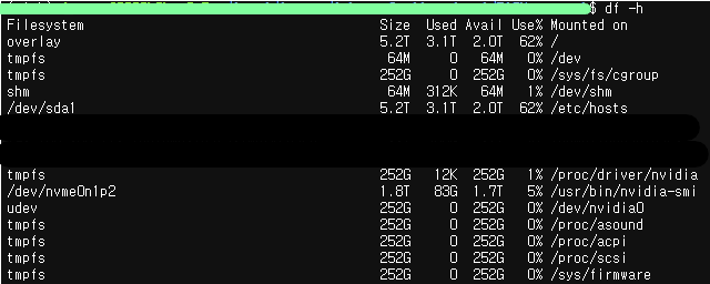 아래 명령어로 현재 컨테이너 내부의 메모리를 확인할 수 있는데, 이때 shm(shared memory) 파트를 보면, 현재 얼마나 차있는지, 사용가능한지 나와있다. 기본적으로 container를 생성하면 128MB가 할당된다고 하는데, 내 경우에는 Docker 기반의 사내 개발 서버를 활용하고 있기 때문에 64M로 할당된 것 같다. 나같은 경우가 아니라 로컬 서버에서 Docker를 실행하여 개발하는 경우, 컨테이너 생성과정에서 "--shm-size"옵션을 주어서 원하는 크기만큼 공유메모리를 늘려줄수도 있다.