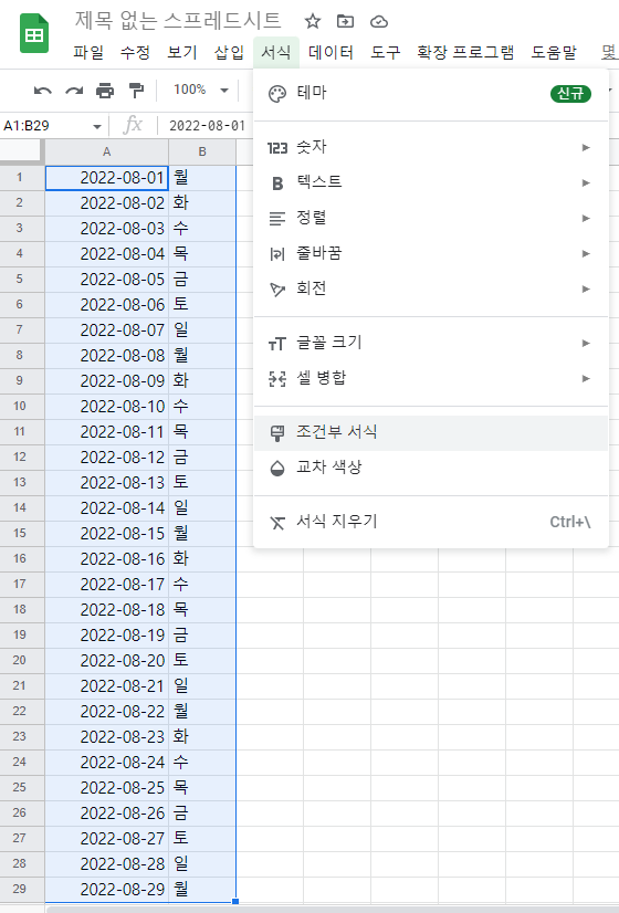 구글 스프레드시트로 다음과 같이 캘린더를 설정할 때, 주말, 공휴일마다 글자 색을 바꾸고 싶을 때가 있다.
