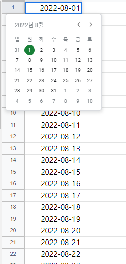 일반적인 엑셀 다루듯이 "yyyy-mm-dd"의 형태로 적고 각 셀의 우측 하단 포인트를 잡고 쭉 내리면 날짜가 알아서 채워질것이다.