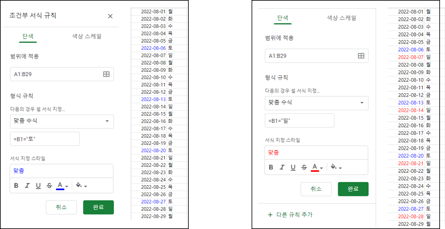 여기선 토요일을 파랗게 칠해줄 예정이다. 따라서 맞춤 수식을 선택 후, 아래에 다음 수식을 적어주고, 서식 지정 스타일에서 글자 색을 파란색으로 설정해주자. 같은 방식으로 일요일도 다른 규칙 추가 버튼을 통해서 똑같이 만들어주자