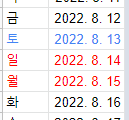 앞에서 만든 요일을 활용해서 토요일은 파랗게 일요일은 빨간색으로 칠해보자