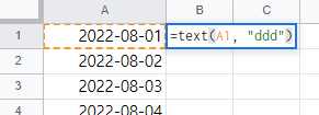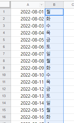 이제 각 날짜의 요일을 채워보자. 우측에 TEXT 수식을 넣어 월,화,수 의 포맷으로 요일을 채울수 있도록 설정하자