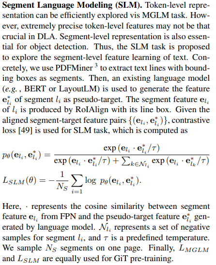 - segment feature $e_{l_i}$ 간의 유사도를 학습? 최대한 segment feature를 target feature에 잘 맞도록 학습한다는 의미인듯? GiT를 다른 잘하는 모델(BERT, LayoutLM)의 성능에 맞도록?