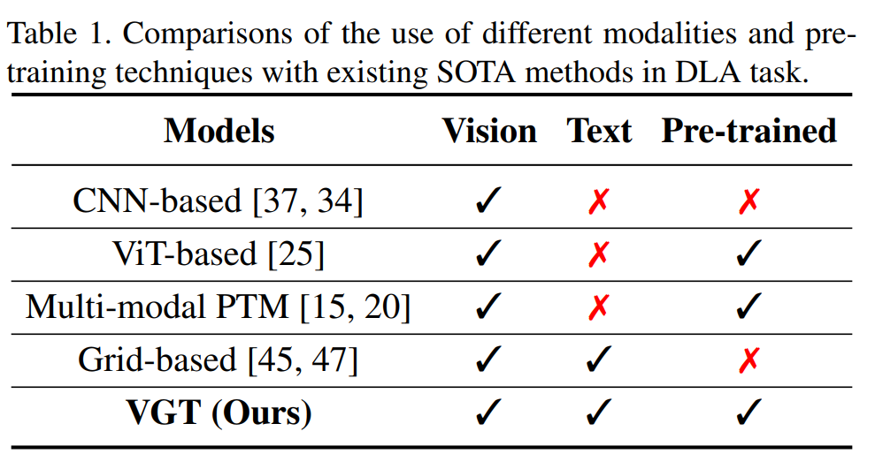 - multi-modal 정보를 최대한 활용하고, pre-trained 기술도 최대한 사용하기 위해서 VGT라는 DLA task를 위한 모델을 소개.