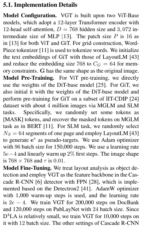 - 최종적으로 Finetuning할 때는 VGT를 Cascade R-CNN detector의 backbone으로 사용하여 layout analysis를 수행하게끔 구현. 이 과정에서 detectron2를 사용하여 구현.