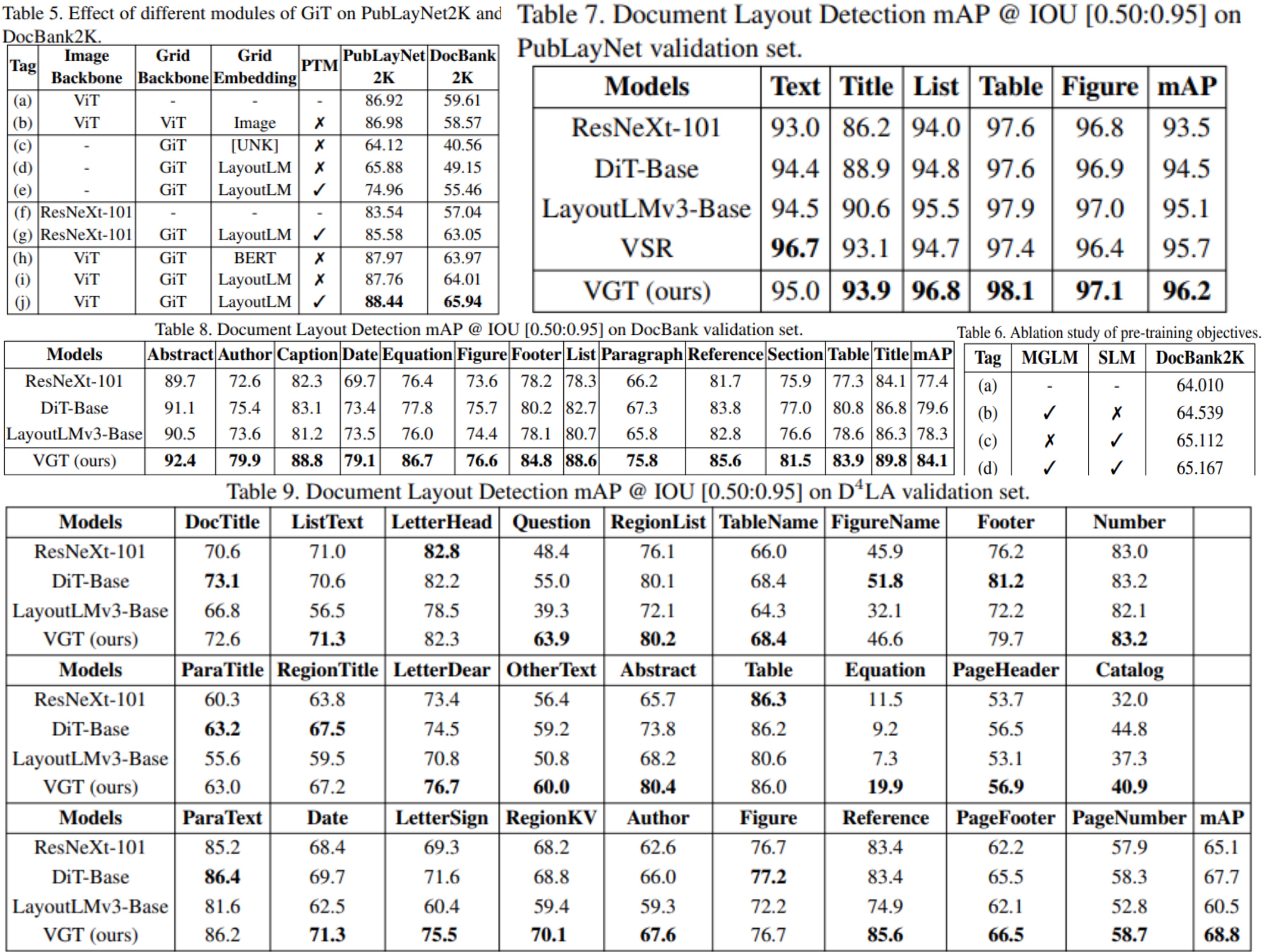 - VGT 모델이 SoTA (PubLayNet, DocBank, $D^4LA$)달성.