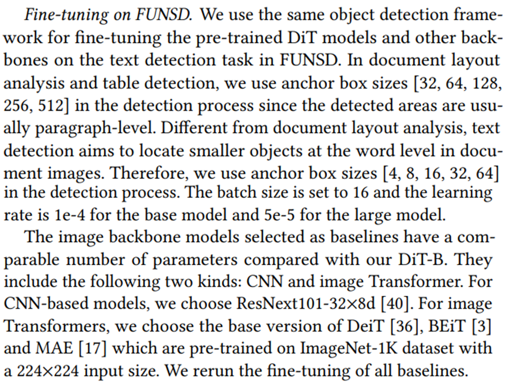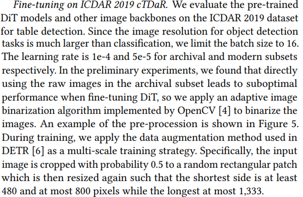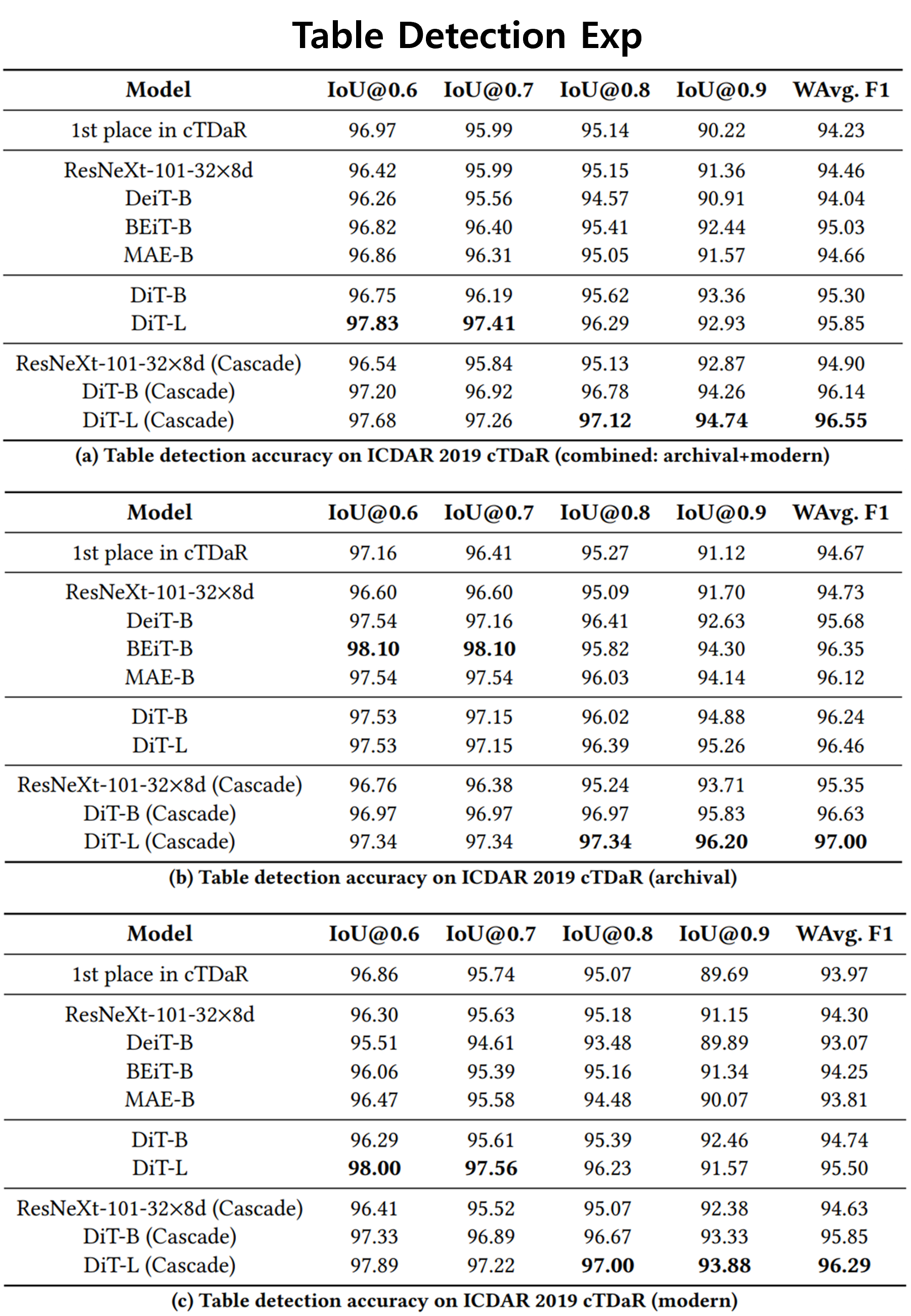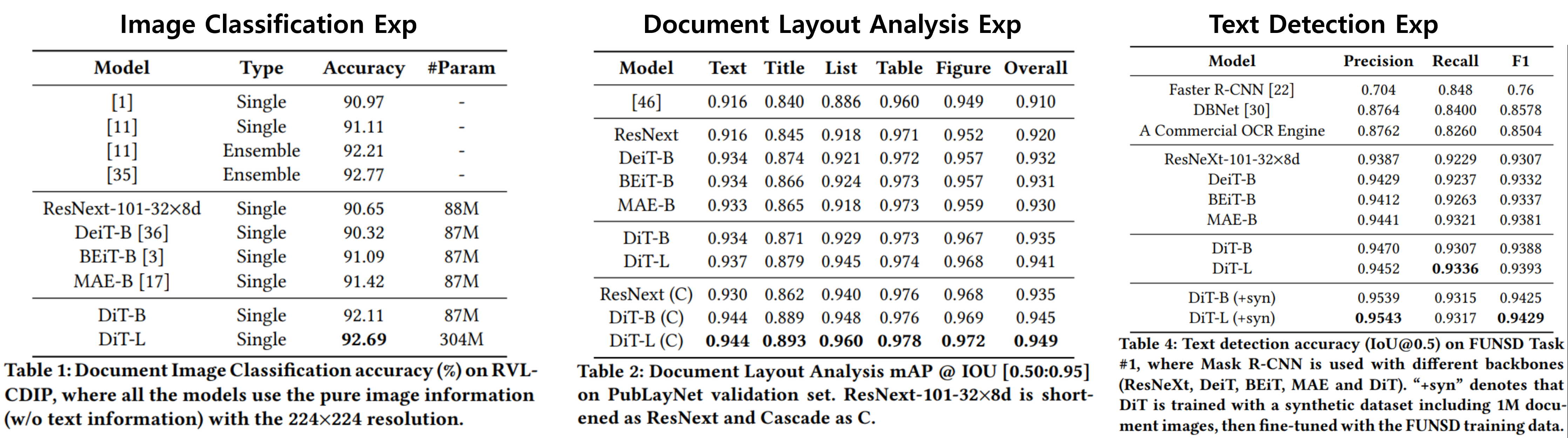 본 논문에서는 DiT를 Image classification, Document Layout Analysis, Table Detection, STD 등 다양한 Document AI task의 Backbone으로 활용하여 성능을 확인했고, 다양한 Task에 대해서 SoTA를 달성했다.