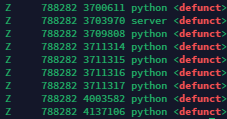 아래 명령어로 실제 좀비 프로세스들은 listup할 수 있어서 확인해보니 대다수 python 이 중단되면서 생긴 쓰레기 프로세스들 인 것 같다.